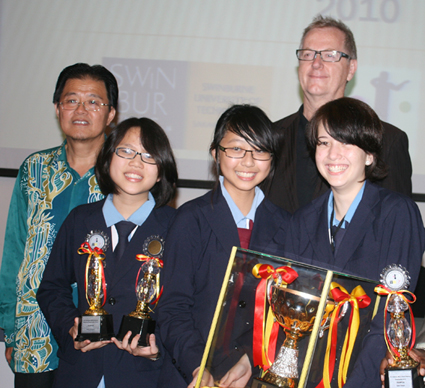 The team of Kimberly Lo, Rebekah Dawn Ba’o Ritchie and Serena Chew from Lodge International School took home the championship trophy in the senior category after defeating SMK Green Road over the motion This House Believes that the 1st World is serious about protecting the environment, it should pay for sustainable development programs in the 3rd World.
