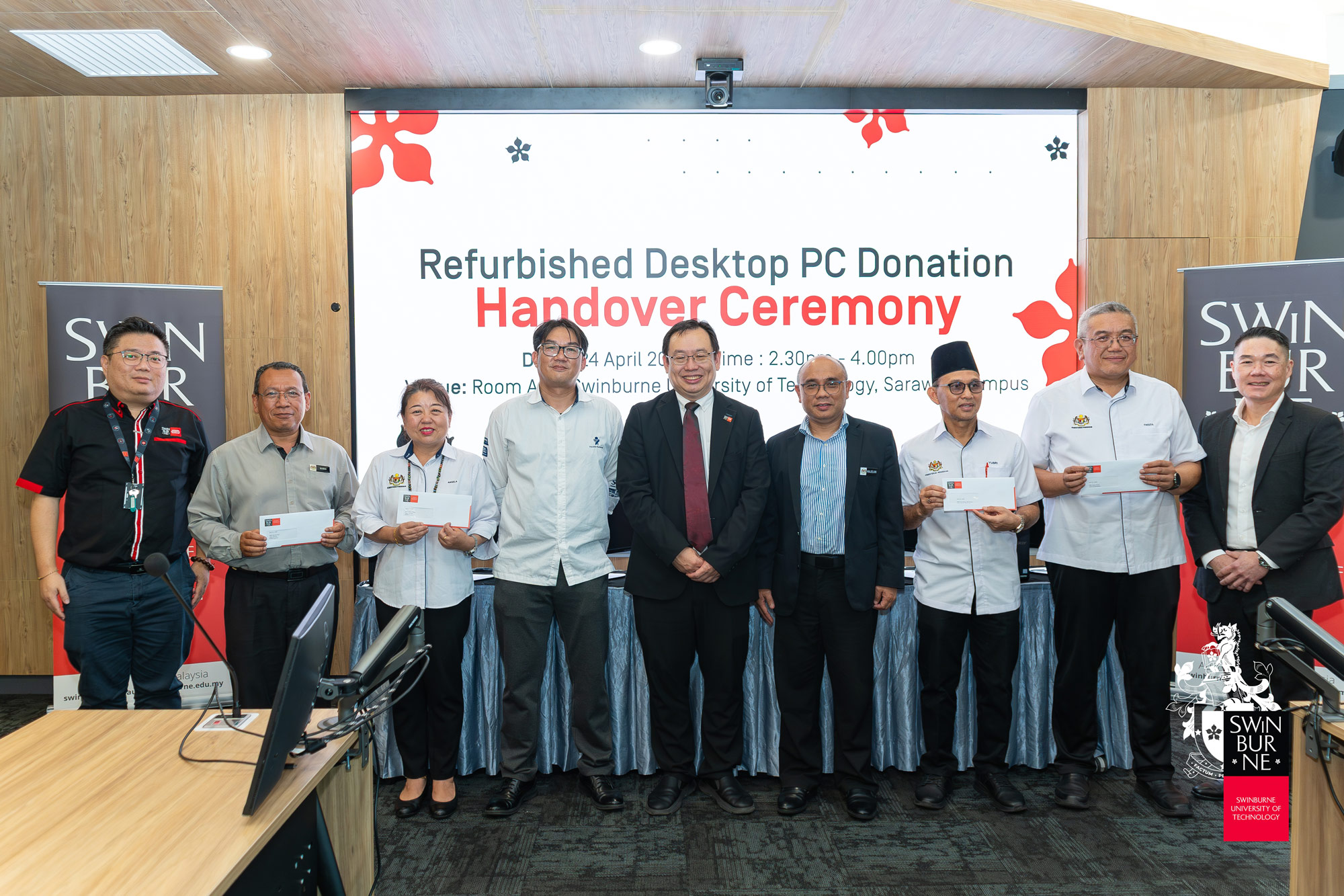 The handover ceremony was held at Swinburne Sarawak on 24 April 2026, with Yayasan Sarawak represented by its Principal Assistant Director (Information Technology, Systems, and Data Management Division) @ Chief Digital Officer, Ts Mohammad Faisal bin Jaffar, and Swinburne Sarawak represented by its Pro Vice-Chancellor and Chief Executive Officer, Ir Professor Lau Hieng Ho. The delegation from the Kuching District Education Office (PPD Kuching) and beneficiary schools was led by Dr Majelan bin Sulong, Kuching District Education Officer.