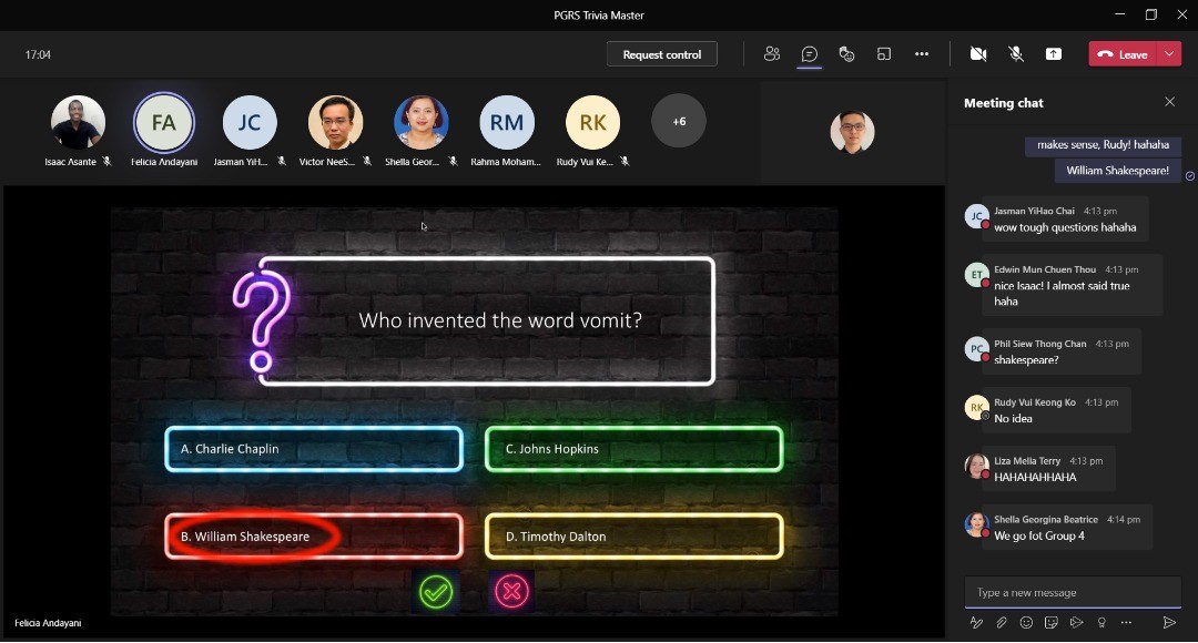 On the event day, the PIC started by dividing 11 participants into 4 groups and explaining how to play the game. Then, the trivia game was started and the participants were so excited and supportive during the game. At the end of each round, the scores were given in the chat room. Finally, group 1 answered the question correctly and became the winner. The winners were Alfred Tan, Ally Tian Lee, and Dayang Sharyati Bt Datu Abdul Salam. Each of the winners will get a notebook as the prize of winning the game. Group photos were taken before the event ended.