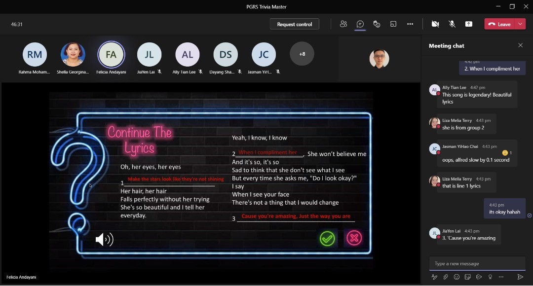 Trivia is a fun, challenging, and competitive game where participants were team up as a group to answer the quizzes. This activity aims to provide the opportunity to the participants to expand their general knowledge and provide entertainment and engagement among the HDR students. There were three rounds of quizzes. The first round was a general knowledge MCQ. The second round was guessing the movie title, and the third round was continuing song lyrics. For each correct answer, the group will get 10 points.