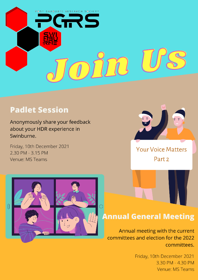 Your Voice Matters (YVM) is an event to gain feedback from students of the Higher Degree by Research (HDR) students in Swinburne Sarawak regarding their program. It is also part of the effort to conduct program monitoring, review, and continual quality improvement of Swinburne’s HDR courses. For this year’s event, PGRS decided to collect student feedback in an interactive manner. Therefore, this event was organized in a two-part format. As an incentive to participants, students who participated in the events were rewarded with Shopee e-vouchers.
