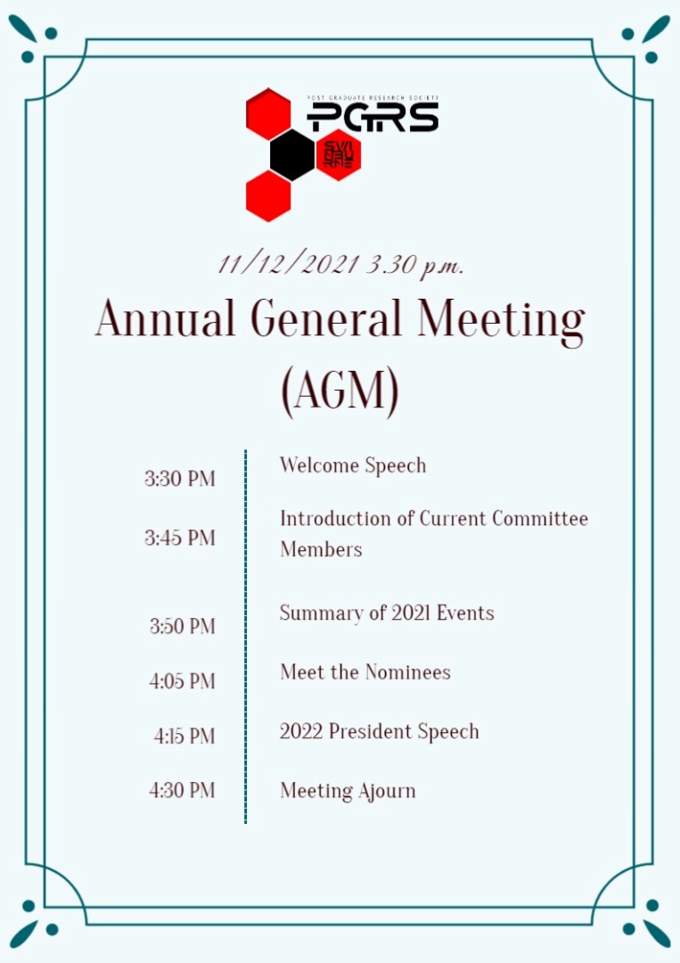 The PGRS Annual General Meeting was successfully held virtually via Microsoft Teams on 3 February 2021 (Wednesday) from 2.30pm to 3.30pm. The meeting officially thanked the PGRS Committee Session 2020 for their commitment and leadership in steering the PGRS through a challenging year, and also welcomed the newly elected committee members for Session 2021. All postgraduates were strongly encouraged to participate actively in PGRS events and activities, which are good platforms for them to interact and share their knowledge and experience with fellow researchers.
